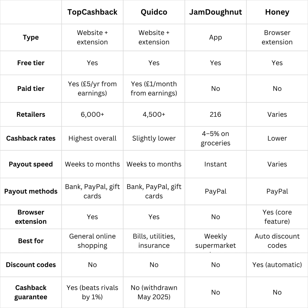 JamDoughnut works differently from the main two. It offers instant cashback when you buy supermarket gift cards, making it the original instant cashback app and particularly useful for weekly grocery shopping at major supermarkets. You buy a gift card through the app before you shop, the cashback hits your account straight away, and you spend the card as normal. Rates of around 4 to 5 percent on supermarkets are typical, and unlike affiliate cashback you don’t have to wait weeks for it to confirm.